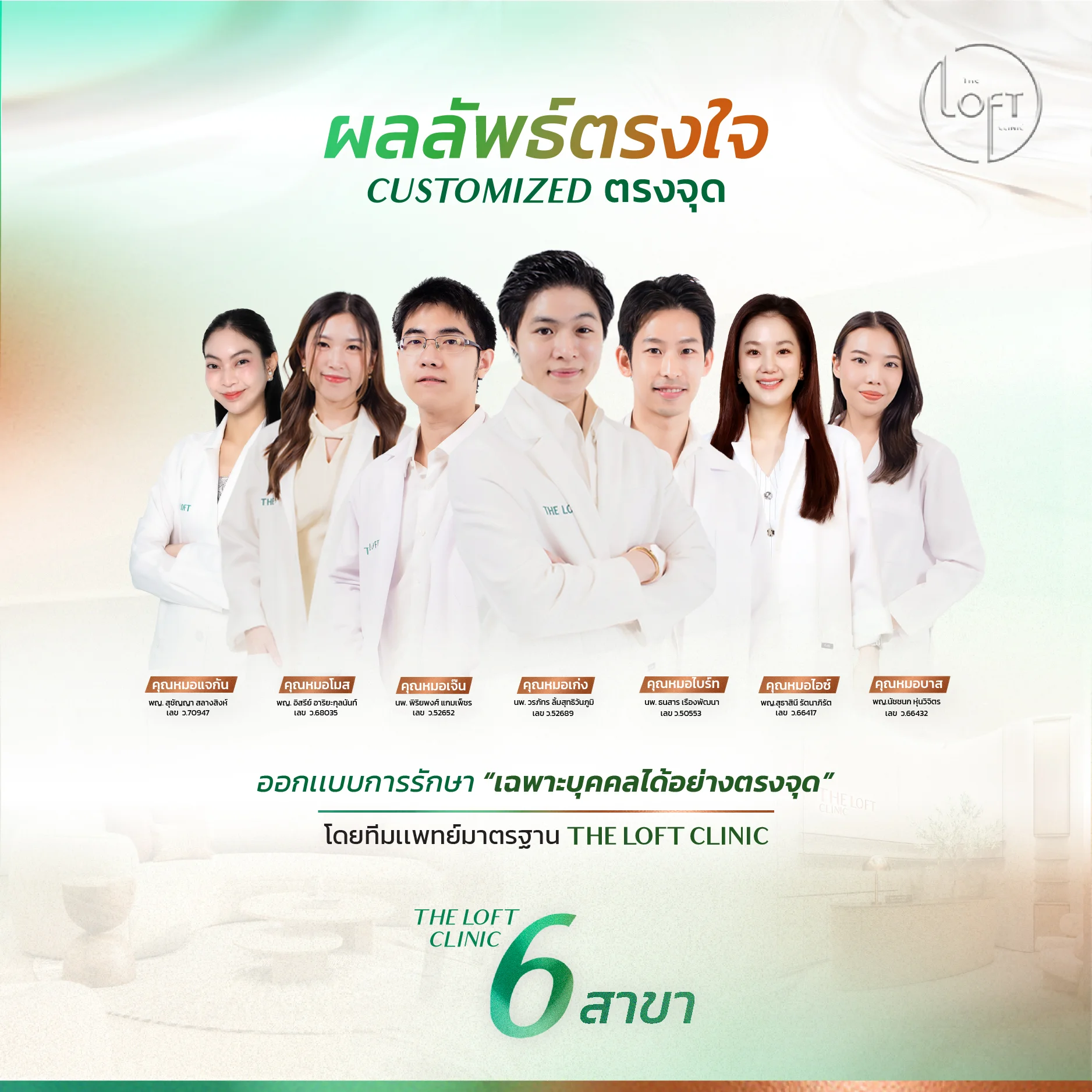 THE LOFT CLINIC พร้อมดูแลคุณด้วยมาตรฐานทางการแพทย์ที่ใส่ใจในทุกรายละเอียด เราเชื่อว่า “ความงามที่ลงตัว คือความงามที่ออกแบบเพื่อคุณเท่านั้น” เพราะความงามของคุณ ควรได้รับการดูแลอย่างมีระดับ